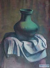 刘老师的油画线条鲜明,色彩温婉,布的纹理和翠绿色的瓶子相映衬。逼真生动。